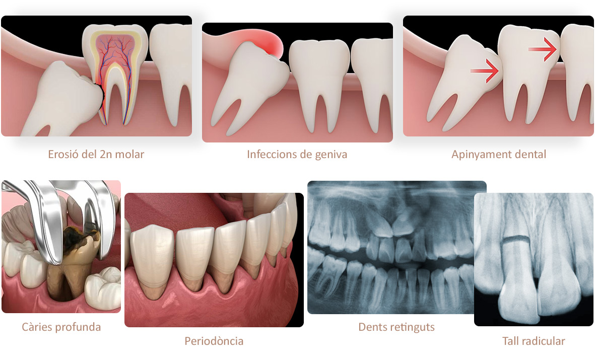 • Queixals del seny malposicionats, que provoquen dolor, infeccions repetides o danyen peces veïnes.